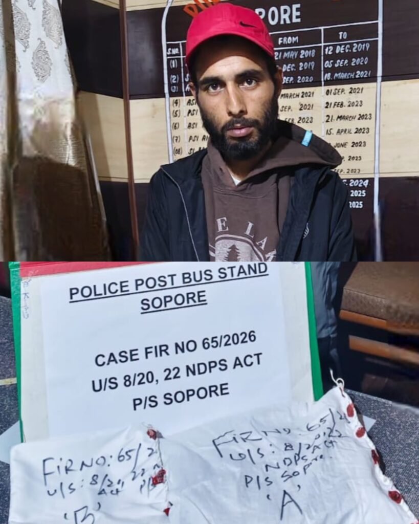 Mir showkat/Sopore: Police Apprehend Drug Peddler in Sopore; Contraband and Psychotropic Substances Recovered Mir showkat/Sopore Continuing its sustained drive against the drug menace, Sopore Police