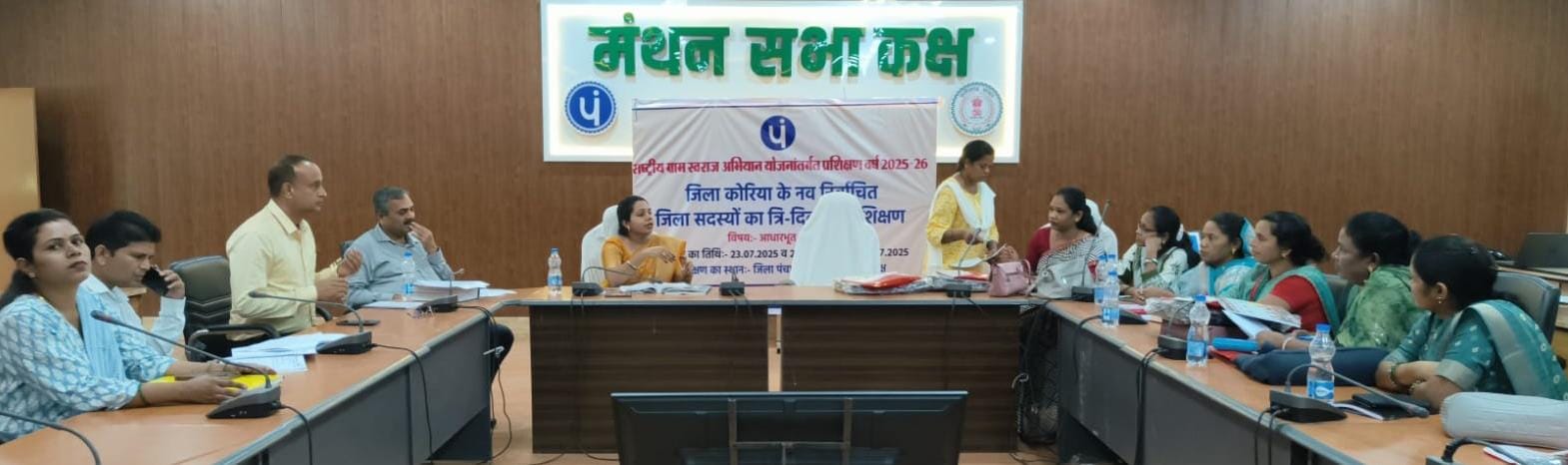 कोरिया 23 जुलाई 2025/ – जिला पंचायत कोरिया के मंथन कक्ष में राष्ट्रीय ग्राम स्वराज अभियान योजना के अंतर्गत जिले के नवनिर्वाचित जनप्रतिनिधियों का त्रिदिवसीय आधारभूत प्रशिक्षण कार्यक्रम प्रारंभ हुआ। इस कार्यक्रम में जिला पंचायत सदस्य श्रीमती सौभाग्यवती सिंह कुसरो, श्रीमती गीता राजवाड़े, श्रीमती शिवकुमारी, श्रीमती सुषमा कोराम, श्रीमती स्नेहलता उदय एवं श्रीमती संगीता सोनवानी सहित कई प्रतिनिधि शामिल हुए।