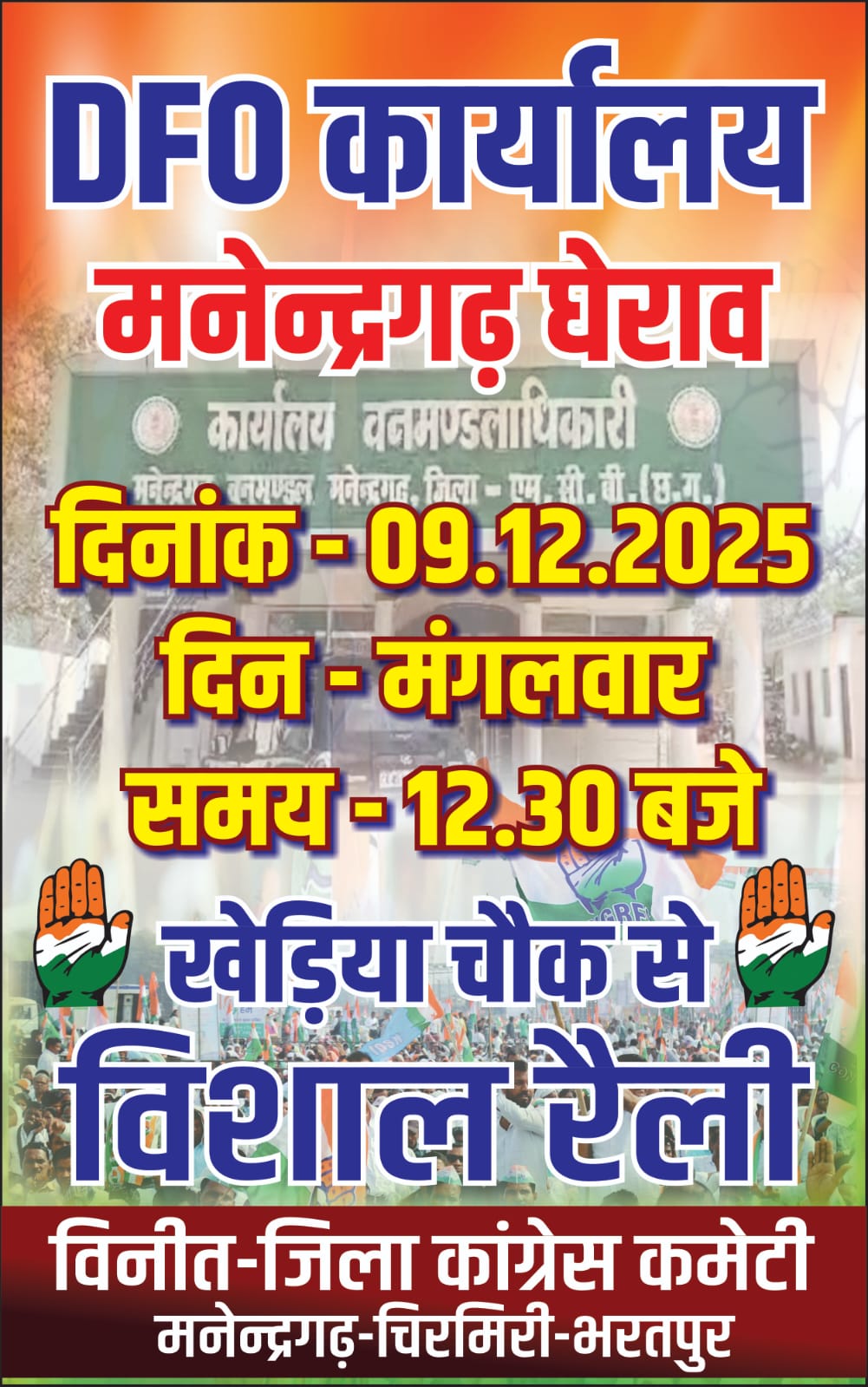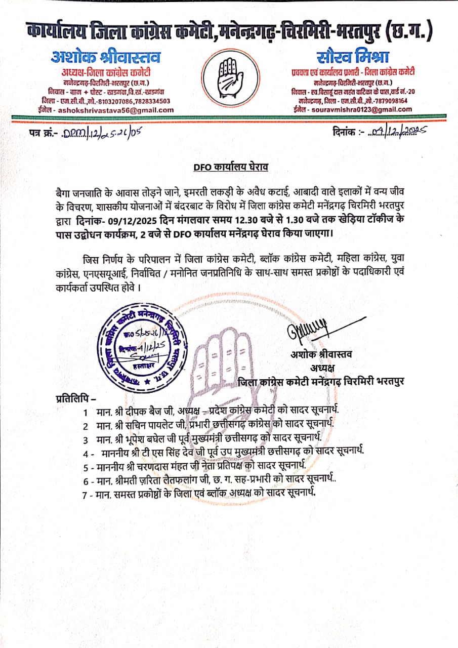 मनेंद्रगढ़। जिला कांग्रेस कमेटी मनेंद्रगढ़–चिरमिरी–भरतपुर ने घोषणा करते हुए बताया कि 9 दिसंबर को खेड़िया चौक से विशाल रैली निकाल कर DFO कार्यालय मनेंद्रगढ़ का विशाल घेराव किया जाएगा। जिले में वन विभाग द्वारा लगातार की जा रही अनियमितताओं, बैगा जनजाति पर हो रहे अन्याय, जंगलों में अवैध कटाई–तस्करी, वन्यजीवों की सुरक्षा में लापरवाही तथा विभागीय अधिकारियों के मनमाने रवैये से जनता में भारी नाराजगी है। इसी के विरोध में कांग्रेस ने बड़े आंदोलन का निर्णय लिया है।