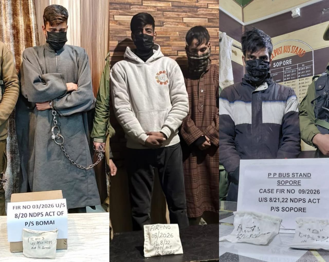 Continuing its sustained drive against drug trafficking, Sopore Police have apprehended four drug peddlers in three separate NDPS cases across Police District Sopore, leading to the seizure of contraband substances and registration of multiple FIRs.