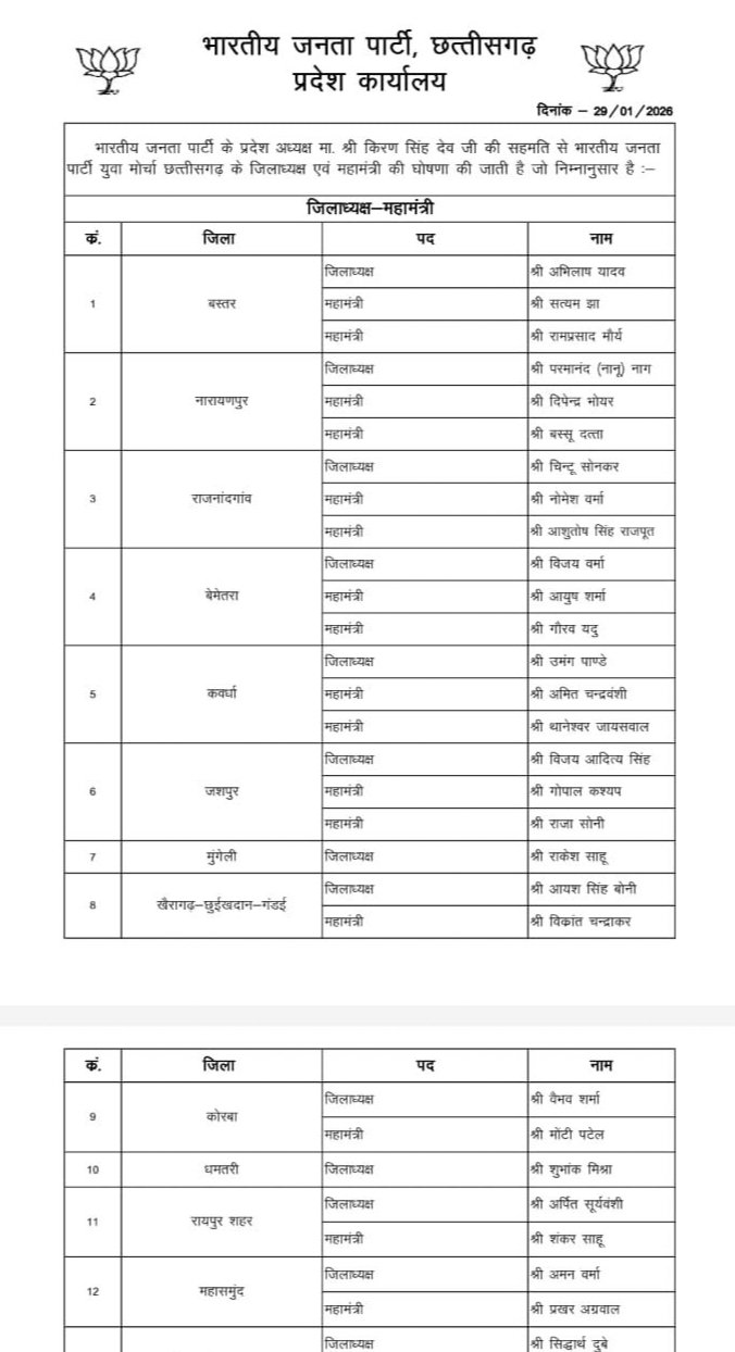 धमतरी / भारतीय जनता पार्टी के प्रदेश अध्यक्ष किरण सिँह देव जी की सहमति से आज भाजयुमो प्रदेश अध्यक्ष राहुल टिकरिहा जी द्वारा जिला अध्यक्षों की सूची जारी की गयी जिसमे धमतरी शहर के युवा समाजसेवी शुभांक मिश्रा को धमतरी जिला के जिलाध्यक्ष के पद मे नियुक्त किया गया, शुभांक शुरुआत से ही समाजिक धार्मिक कार्यों मे सक्रिय रहे है शुभांक के नियुक्ति पश्चात् जिले के युवाओं मे अत्यंत हर्ष का माहौल है व उनके स्वागत मे सभी भाजपा युवा मोर्चा कार्यकर्ता तैयारियो मे लगे हुए है