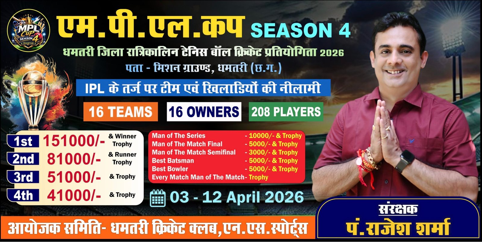 धमतरी-:शहर के सार्वजनिक सरोकार से जुड़े हुए विभिन्न धार्मिक सामाजिक आयोजन के बाद धर्म प्रेमी समाजसेवी पंडित राजेश शर्मा द्वारा 22 मार्च से प्रारंभ हुआ खेल पखवाड़ा फुटबॉल तथा बच्चों के विभिन्न खेल प्रतिस्पर्धाओं के बाद 3 अप्रैल से क्रिकेट के रोमांच में तब्दील हो जाएगा जिसकी काफी लंबे समय से प्रतीक्षा की जा रही है शहर के खेल प्रेमी इस आयोजन के प्रति काफी उत्सुक हैं क्योंकि इसमें हजारों रुपए के पुरस्कार के साथ ही उत्कृष्ट खिलाड़ियों के लिए भी अलग से इनाम की व्यवस्था की गई है जहां प्रथम पुरस्कार के रूप में 1 लाख 51000 हजार, दूसरा ही ईनाम 81000 हजार रुपए, वहीं तीसरा 51000 हजार तथा चतुर्थ 41000 हजार रखा गया है। इसके साथ ही मैन ऑफ द मैच खिलाड़ियों तथा उत्कृष्ट प्रदर्शन करने वालों को 10000 रूपए से लेकर 5000 रुपए तक नगद पुरस्कार दिए जाएंगे। अपने तरीके से अभी तक के होने वाले आयोजनों से अलग किस्म के इस आयोजन में विशालकाय स्किन भी आकर्षण का केंद्र होगा चार दिशाओं में लगने वाले कैमरे से दिखाने की मैच को व्यवस्था होगी, आयोजन समिति के संरक्षक तथा आयोजन पंडित राजेश शर्मा ने कहा है कि शहर के खेल इतिहास में अभी तक के होने वाले आयोजनों में इस आयोजन को अलग अंदाज में शहर वासियों को समर्पित करने का प्रयास किया जा रहा है जिसके लिए नई टेक्नोलॉजी के साथ ही खिलाड़ियों को प्रोत्साहित करने हेतु बड़ी राशि के साथ ही रनर कप भी प्रदान किए जाएंगे।वही खेल पखवाड़ा के संयोजक योगेश रायचुरा, क्रिकेट आयोजन के संयोजक रघुवीर ने बताया कि मिशन मैदान में होने वाले इस आयोजन को यूट्यूब चैनल में भी देखा जा सकेगा इसके साथ ही ड्रोन कैमरे से खेल के हर परफॉर्मेंस को विशाल स्क्रीन के माध्यम से ग्राउंड में देखने की भी व्यवस्था की गई है दर्शक दीर्घा में लगभग 10000 लोग की उपस्थिति का व्यवस्था किया गया है जिसके लिए सुरक्षा हेतु पुलिस सहित प्राथमिक उपचार के लिए अलग से काउंटर बनाए गए हैं शुद्ध पेयजल की उपलब्धता भी सुनिश्चित की गई है।