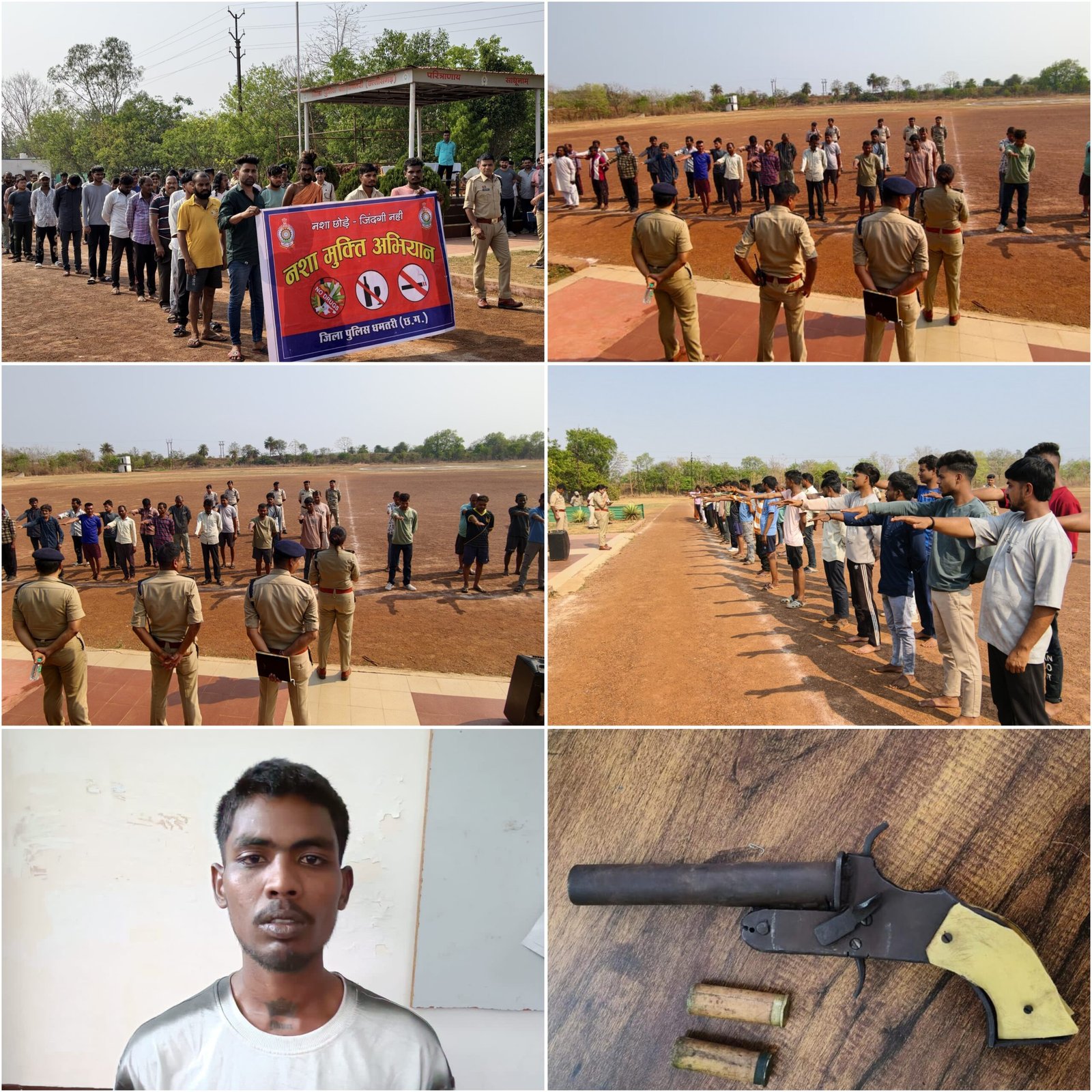 04 सूखे नशे के सौदागर,17 आबकारी एक्ट एवं 01 व्यक्ति देशी कट्टा के साथ आर्म्स एक्ट में गिरफ्तार,30 व्यक्तियों के विरुद्ध की गई प्रतिबंधात्मक कार्यवाही नशे और अपराध के खिलाफ जीरो टॉलरेंस, अभियान आगे भी लगातार रहेगा जारी आईजी रायपुर रेंज रायपुर अमरेश कुमार मिश्रा के निर्देशन एवं मार्गदर्शन में एसपी.धमतरी के नेतृत्व में धमतरी पुलिस द्वारा कल शाम से लेकर सुबह एक विशेष सघन अभियान निश्चय चलाकर जिले के विभिन्न थाना क्षेत्रों में कुल 150 स्थानों पर दबिश दी गई एवं संदेहियों को चेक किया गया।इस दौरान अलग-अलग कुल 30 टीम बनाकर गुंडा-बदमाश,असामाजिक तत्व एवं मादक पदार्थों के अवैध कारोबारियों पर कड़ी कार्यवाही की गई।अभियान की प्रमुख कार्यवाही-: एनडीपीएस एक्ट-: थाना सिटी कोतवाली धमतरी, थाना अर्जुनी, थाना कुरूद एवं थाना भखारा में एनडीपीएस एक्ट के तहत वैधानिक कार्यवाही किया गया।जिसमें कुल 04 प्रकरण,04 आरोपी गिरफ्तार किये गये हैं। जप्त मादक पदार्थ :कुल 3.97 किलो मादक पदार्थ गांजा जप्त किया गया। एनडीपीएस.एक्ट में गिरफ्तार आरोपी का नाम(01) हेमंत पांडेय पिता अशोक पांडेय उम्र 26 वर्ष साकिन स्टेशन पारा धमतरी, हाल महिमा सागर वार्ड,मैला गढ्ढा के पास अटल आवास धमतरी।(02) गुलशन कुमार साहू पिता खेमलाल साहू उम्र 28 वर्ष,साकिन सरसोंपुरी, थाना अर्जुनी, जिला धमतरी (छ.ग.)(03) लिखेन्द्र कुमार साहू पिता हेमलाल साहू ,उम्र 22 वर्ष साकिन वार्ड नं 12 मिनी माता चौक भठेली,थाना भखारा, जिला धमतरी(छ.ग.)(04) भूपेंद्र साहू पिता लक्ष्मी साहू उम्र 22 वर्ष,साकिन इंद्रानगर कुरूद, थाना कुरुद, जिला धमतरी (छ.ग.)आबकारी एक्ट-: 34(2) में 06 प्रकरण में 06 व्यक्तियों से कुल 113.96 लीटर अवैध शराब जप्त किया है।एवं 34(ए) आबकारी एक्ट के तहत 10 प्रकरण मे 10 व्यक्ति एवं 36(च) में 01 प्रकरण 01व्यक्ति के तहत वैधानिक कार्यवाही की गई है।कुल 17 प्रकरणों में 17 व्यक्तियों को आबकारी एक्ट के तहत गिरफ्तार कर वैधानिक कार्यवाही की गई है। 34(2) के प्रकरण में गिरफ्तार 06 आरोपी का नाम-(01) तारकेश्वर उर्फ टाकू पिता स्व.आनंद राम मीनपाल, उम्र 40 वर्ष,साकिन अर्जुनी, थाना अर्जुनी, जिला धमतरी,(छ.ग.)(02) गंगा राम कुंजाम पिता अशोक कुंजाम, उम्र 28 वर्ष साकिन बागोडार,(जोगीडीह) थाना अर्जुनी,जिला धमतरी (छ.ग.)(03) देव कुमार ध्रुव पिता जेठू राम ध्रुव उम्र 59 वर्ष साकिन हिंच्छापुर थाना सिहावा(04) देवंतीन ध्रुव पति स्वर्गीय मोहन ध्रुव उम्र 60 वर्ष साकिन नवापारा रामनगर सांकरा थाना सिहावा।(05) पप्पू सिन्हा पिता कचरू राम सिन्हा उम्र 34 वर्ष ,साकिन बोइर गांव थाना मेचका,जिला धमतरी।(06) चमेली साहू पति चुम्बन साहू उम्र 40 वर्ष निवासी ग्राम बेलोरा,थाना मगरलोड प्रतिबंधक कार्यवाही-: धारा 170,126,135 बीएनएसएस. के तहत – 30 प्रकरण 30 व्यक्तियों के विरुद्ध प्रतिबंधात्म