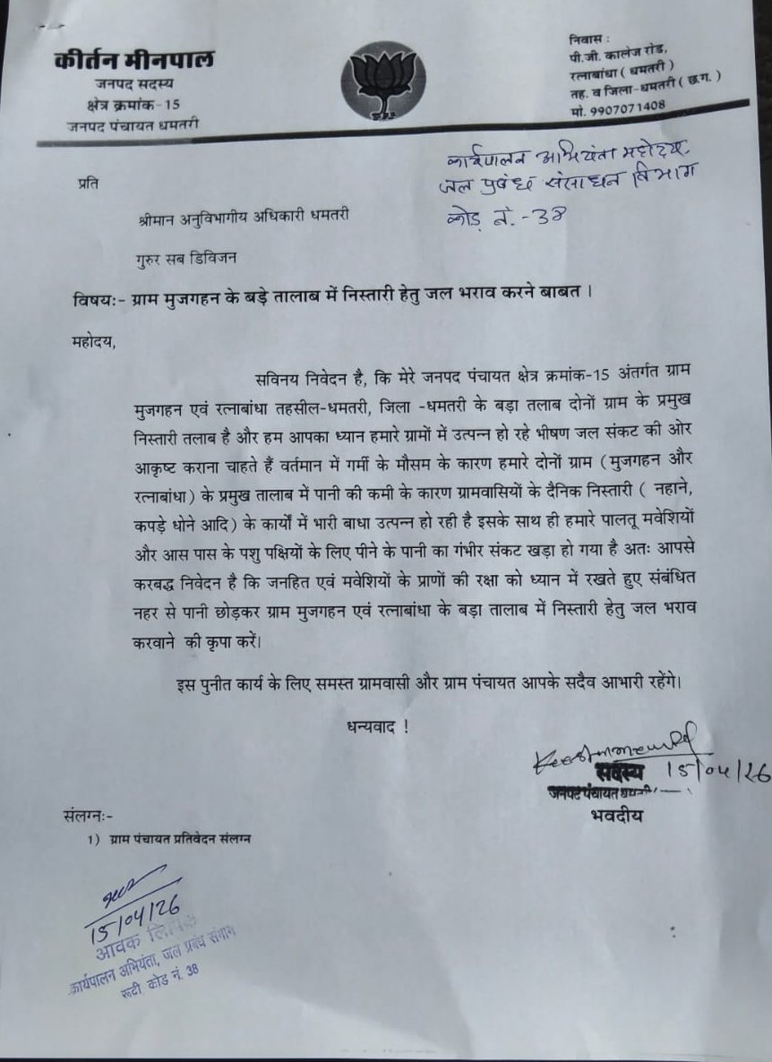 धमतरी,जनपद पंचायत धमतरी के क्षेत्र क्रमांक-15 के जनपद सदस्य कीर्तन मीनपाल ने अपने क्षेत्र के ग्राम मुजगहन और रत्नाबाधा के तालाब में गहराते जल संकट को लेकर प्रशासन का ध्यान आकृष्ट कराया है। उन्होंने जल संसाधन विभाग के कार्यपालन अभियंता को पत्र सौंपकर संबंधित नहर से पानी छोड़कर दोनों गांवों के प्रमुख बड़े तालाबों में जल भराव करने की पुरजोर मांग की है।सौंपे गए मांग पत्र जिसके साथ ग्राम पंचायत का प्रतिवेदन भी संलग्न है में बताया गया है कि वर्तमान में भीषण गर्मी के मौसम के कारण ग्राम मुजगहन एवं रत्नाबाधा के निस्तारी तालाबों का जलस्तर काफी गिर गया है। तालाबों में पानी की कमी के चलते ग्रामीणों को अपनी दैनिक निस्तारी नहाने, कपड़े धोने आदि के कार्यों में भारी बाधा उत्पन्न हो रही है। इसके साथ ही, पालतू मवेशियों और आस-पास के पशु-पक्षियों के लिए पीने के पानी का अत्यंत गंभीर संकट खड़ा हो गया है।जनपद सदस्य कीर्तन मीनपाल ने इस गंभीर विषय पर अपनी चिंता और विचार व्यक्त करते हुए कहा:भीषण गर्मी के इस दौर में हमारे अन्नदाताओं और ग्रामीणों को पानी जैसी मूलभूत आवश्यकता के लिए तरसना पड़े, यह बेहद चिंताजनक है। मुजगहन और रत्नाबाधा के बड़े तालाब दोनों गांवों की जीवनरेखा हैं। वर्तमान में न केवल इंसान, बल्कि हमारे बेजुबान मवेशी और पशु-पक्षी भी बूंद-बूंद पानी के लिए मोहताज हो रहे हैं। एक जनप्रतिनिधि होने के नाते मेरी सर्वोच्च प्राथमिकता जनहित और इन मवेशियों के प्राणों की रक्षा करना है। मैंने जल संसाधन विभाग से करबद्ध निवेदन किया है कि तत्काल प्रभाव से संबंधित नहर का पानी हमारे गांवों के तालाबों में छोड़ा जाए। मुझे पूर्ण विश्वास है कि प्रशासन इस पुनीत कार्य को त्वरित गति से पूरा करेगा, जिससे ग्रामीणों को इस भीषण गर्मी में राहत मिल सके। मीनपाल ने प्रशासन से आग्रह किया है कि स्थिति की गंभीरता को समझते हुए बिना किसी विलंब के तालाबों में पानी भरने की कार्रवाई सुनिश्चित की जाए, ताकि ग्रामीणों के निस्तारी समस्या और मवेशियों के पानी पीने की समस्या को टाला जा सके।