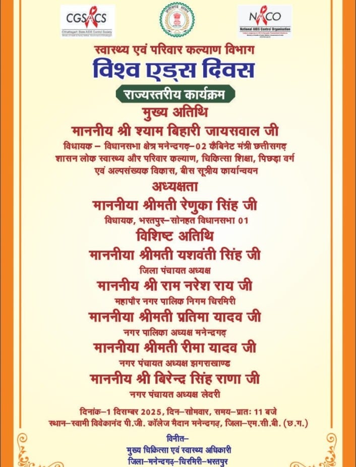 विश्व एड्स दिवस पर राज्यस्तरीय कार्यक्रम आज मनेंद्रगढ़ में आयोजित